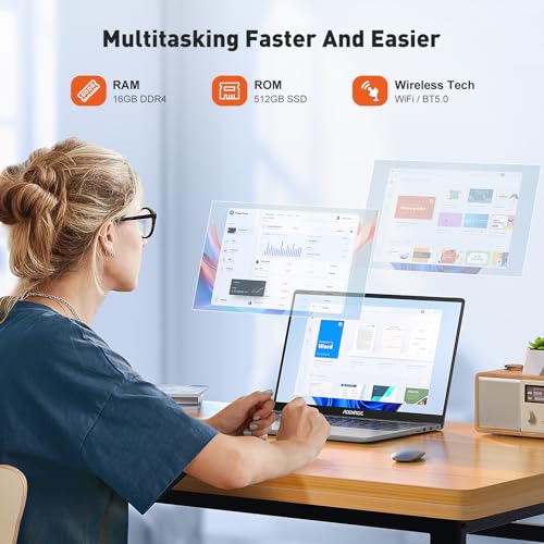 【16 GB de RAM y 512 GB de almanacemiento】Ordenador Portátil Cuenta con 16 GB de RAM DDR4 ultrarrápida, que ofrece un enorme aumento del 50 % en la velocidad en comparación con las máquinas equipadas con DDR3. Con su SSD M.2 de 512 GB incorporado, incluso admite almacenamiento ampliable a través de una tarjeta TF de 128 GB, disfrutará de un amplio almacenamiento para acomodar todos sus valiosos archivos, lo que garantiza un sistema con una capacidad de respuesta perfecta