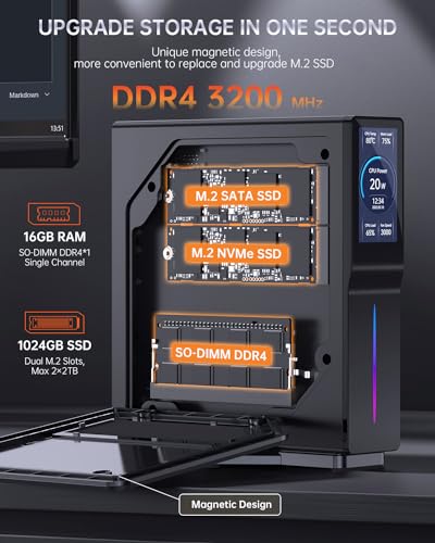 【16GB DDR4 + 1024GB SSD, Fácil de Actualizar】 Mini PC S1 RGB con 16GB DDR4 3200 MHz, SSD NVMe M.2 de 1 TB (dos ranuras M.2, una acepta SSD SATA, la otra es adaptable PCIE/SATA), máximo 2 TB . Más memoria, menos latencia: esta mini computadora te brinda suficiente espacio de almacenamiento y velocidad para cambiar entre aplicaciones y guardar todos tus archivos. Diseño magnético único, expansión de memoria en un segundo. (No se admite HHD/SSD de 2,5 pulgadas)