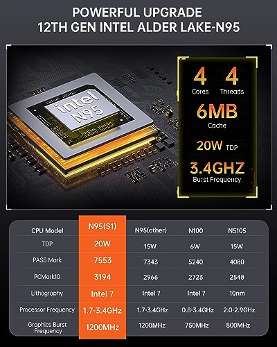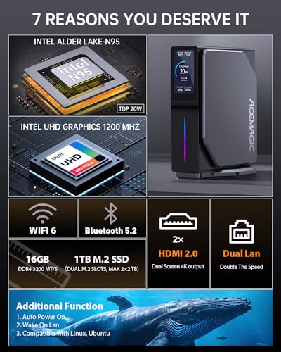 ACEMAGIC S1 Mini PC con LCD DIY, 16GB DDR4 1024GB (1TB) M.2 NVMe SSD Mini Ordenador,Intel Alder Lake-ɴ95 Mini PC Sobremesa(hasta 3,4GHz, 20W TDP),Micro PC WiFi 6/BT 5.2/4K UHD/Dual LAN/Oficina/Negocio
