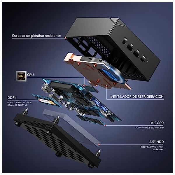【Super Velocidad y Gran Capacidad】Este Computador mini de sobremesa viene con 32GB de memoria DDR4 de doble canal (2x16G, hasta 3200MHz) y un enorme disco duro SSD de 512GB, que es estable y rápido sin caídas de velocidad cuando se manejan archivos grandes y se ejecutan múltiples programas al mismo tiempo. Si le preocupa quedarse sin capacidad, puede añadir un disco duro adicional de 2,5″ para ampliar el espacio de almacenamiento a 2TB.