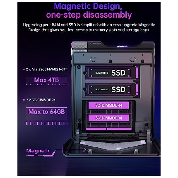 【Cool Appearance, Exclusive Magnetic Design】El ordenador de sobremesa Mini PC destaca el estilo de PC de juegos, con luces RGB que se suman a su aspecto fresco. ¡Su diseño vertical ahorra espacio y el diseño magnético hace que la expansión de la configuración sea fácil!