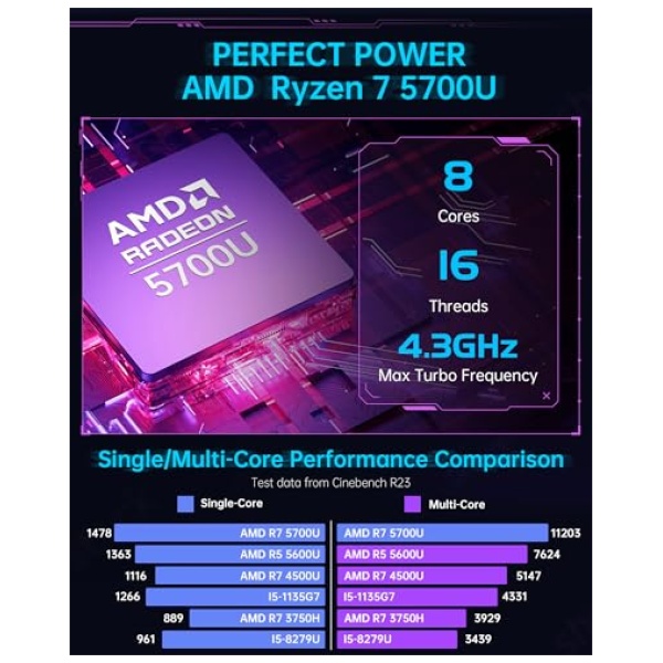 【High performance AMD CPU】AMR5 Mini ordenador está alimentado por AMD Ryzen 7 5700U con 8 núcleos y 16 hilos con un reloj base de 1,9 GHz y un reloj boost máximo de hasta 4,4 GHz. Esta alta frecuencia garantiza un funcionamiento fluido, un procesamiento inteligente y la máxima estabilidad del procesador.