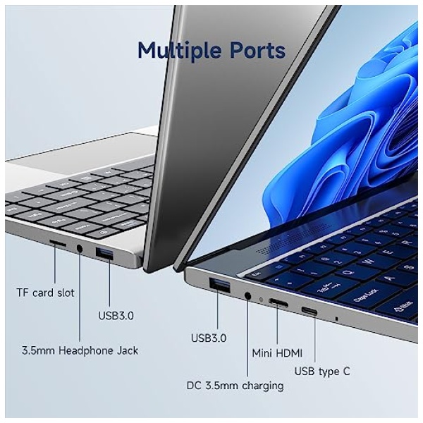 💻【Portabilidad】 Este computadora portatil con Windows 11 es ultraligero, pesa solo 1,3 kilogramos y es conveniente para llevar en viajes de placer o negocios. La batería de 6000mAh/7.6V ofrece una gran autonomía para este portátil. Este ordenador dispone de varios puertos, como USB 3.0, Type-C, Mini HDMI, auriculares de 3,5 mm, ranuras para tarjetas TF, que pueden satisfacer completamente las necesidades diarias de su ocio o trabajo.