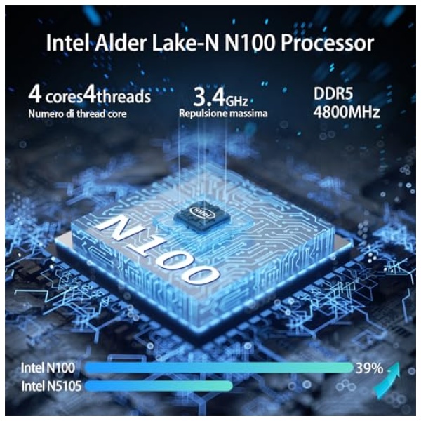 【12th Gen Intel Alder Lake N100 Mini PC】Con alto rendimiento y tamaño pequeño funciona con el último procesador Intel Alder Lake-N100 de 12.ª generación (4C/4T, 6 MB de caché, hasta 3,4 GHz, 6 W TDP) y ofrece más de 25 % más de rendimiento que N5105/N5095.Es una mini pc 8GB ram de escritorio multipropósito diseñada para educación, oficina en el hogar, centro de medios o HTPC, PC de administración de impresoras, señalización digital o conferencias.