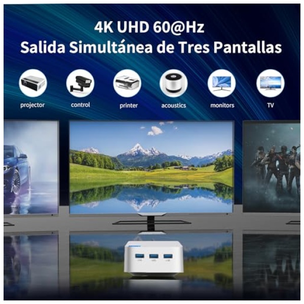 【HD 4K@60Hz 3 Pantalla, Disfrute Visual 】La mini pc de escritorio está equipada con gráficos Intel UHD (Máx 750 MHz), ofrece un rendimiento de gráficos potente, 3x HDMI,admite reproducción de video 4K. Conecta la mini pc sobremesa completo a un proyector como cine en casa, disfruta de una variedad de conversaciones, para que pueda navegar por la web con Chrome y otros navegadores, y ver videos de Netflix, Hulu, Philo y Amazon en el televisor de alta definición de su sala de estar.