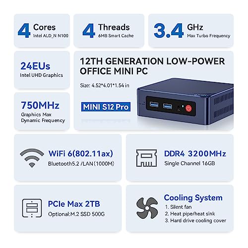Beelink Mini S12 Pro Mini PC, 12th Intel Alder Lake-N100 (4C/4T, hasta 3,4GHz) 16GB DDR4 RAM 500GB PCIe M.2 SSD, Mini Ordenador de Sobremesa 4K@60Hz Doble HDMI, WiFi6, Bluetooth 5.2, Gigabit Ethernet