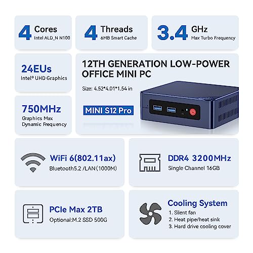 Beelink Mini S12 Pro Mini PC, Mini Ordenador de Sobremesa con Alder Lake-N N100, 16GB DDR4 +500GB M.2 PCIe 2280 NVMe SSD, WIFI6, Dual HDMI, Pantalla Dual, 1000Mbps, BT 5.2