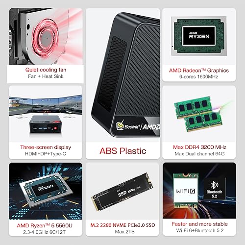 Beelink Ser5 Mini PC, AMD Ryzen 5 5560U (7nm, 6C/12T) hasta 4.0GHz, Mini Ordenador 16GB DDR4 RAM 500GB NVME SSD, Micro PC 4K@60Hz Triple Display, Mini PC Desktop W11 WiFi6 BT5.2