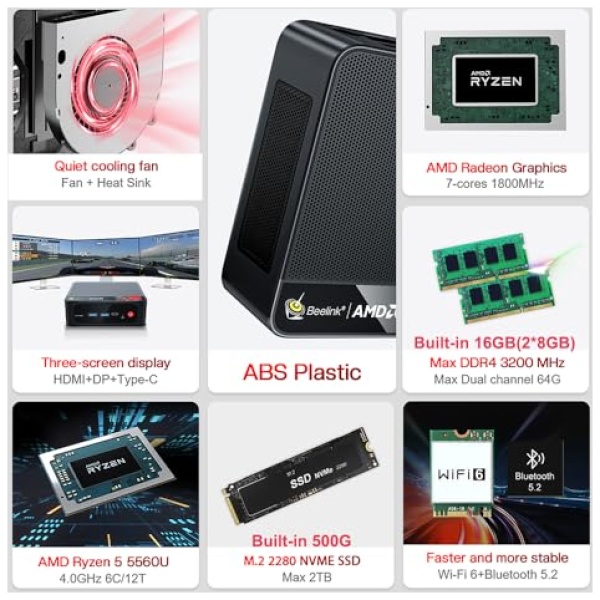 Beelink SER5 Mini PC, Mini Ordenador con AMD Ryzen 5 5560U (6C/12T hasta 4.0Ghz), 16G DDR4+500GB NVMe M.2 2280 SSD, 1000Mbps, WiFi 6, BT 5.2, DP, HDMI, Type-C