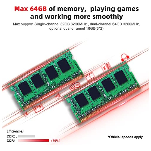 [Almacenamiento ampliable] DDR4 integrado de 16 GB (2 x 8 GB) de RAM, NVMe M.2 SSD de 500 GB (velocidad de lectura de hasta 2500 MB/s), que proporciona suficiente capacidad para almacenar imágenes, vídeos, música, juegos, etc. Compatible con bricolaje ampliable almacenamiento, DDR4 de hasta 64 GB, SSD NVMe de hasta 2 TB y soporte de hasta 2 TB de disco duro SATA de 2,5″, más espacio de almacenamiento hará que la Mini PC funcione sin problemas.