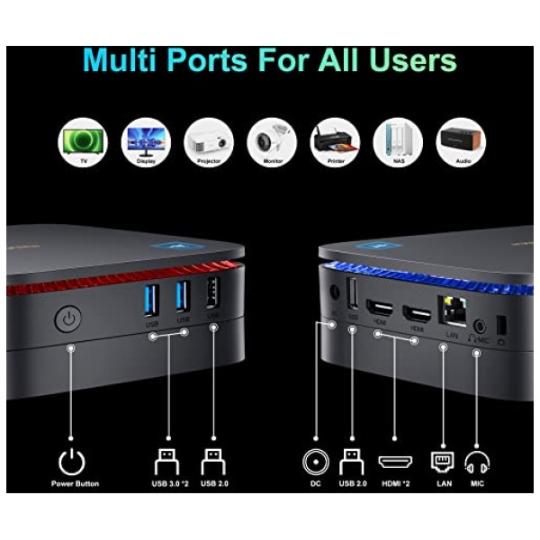 【Máquina pequeña, funciones múltiples】MP60 MINI PC con 2 puertos HDMI 2.0, fácil de obtener pantalla dual 4K HD (60Hz); teclado y mouse a través de conexión bluetooth; con 2 puertos USB 2.0 y 2 puertos USB 3.0, 1 puerto para auriculares con micrófono, 1 puerto RJ45 Gigabit Ethernet, viene con 1 adaptador, 1 montaje VESA, 1 manual de usuario, 1 cable HDMI. La forma más fácil de crear una vida conveniente, satisfacer sus diferentes necesidades, como trabajo, Internet, estudio en el hogar, etc.