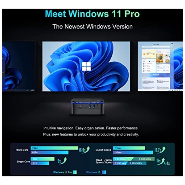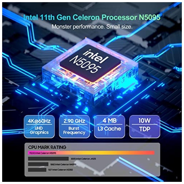 【Cuerpo pequeño con gran potencia】Blackview Mini PC está equipado con un procesador Intel Celeron N5095 de cuatro núcleos (frecuencia operativa de hasta 2,9 GHz), GPU Intel HD Graphics 500 y Windows 11 Pro de 64 bits preinstalado. La configuración de Blackview Mini Computer puede manejar fácilmente cualquier escenario de uso que pueda imaginar, ofrece una capacidad de respuesta y una suavidad increíbles.