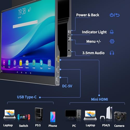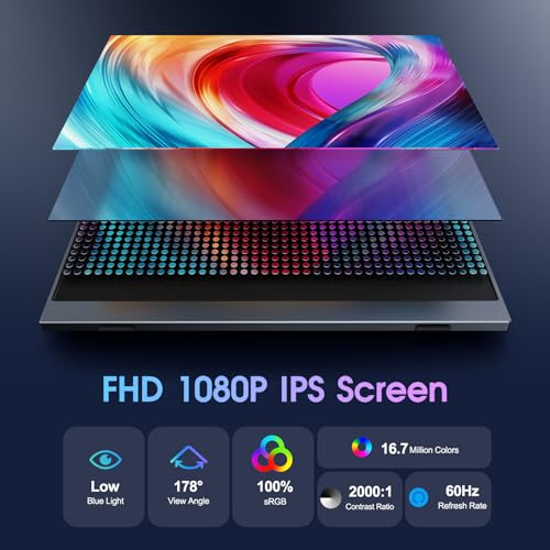 【Full HD Screen】 Monitor portatil con panel LCD IPS, resolución Full HD de 1920×1080, frecuencia de actualización de 60Hz, ángulo de visión de 178°, cobertura de gama de colores sRGB del 100%, pantalla HDR de protección ocular.