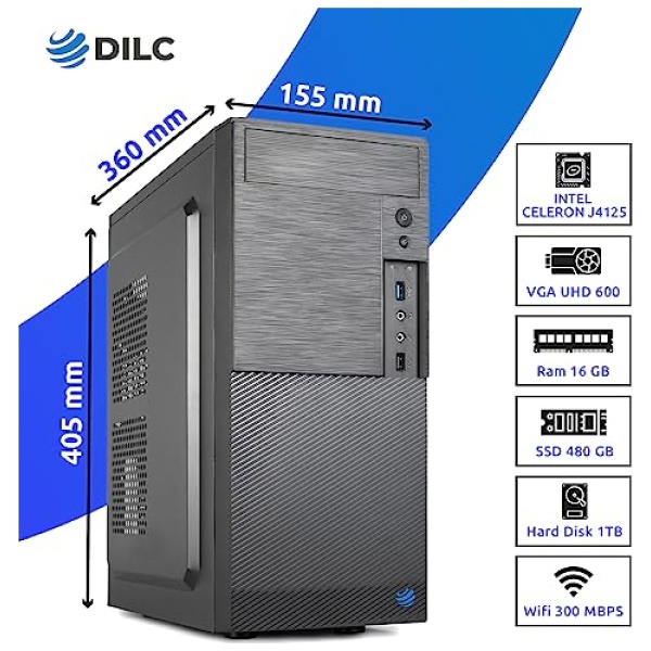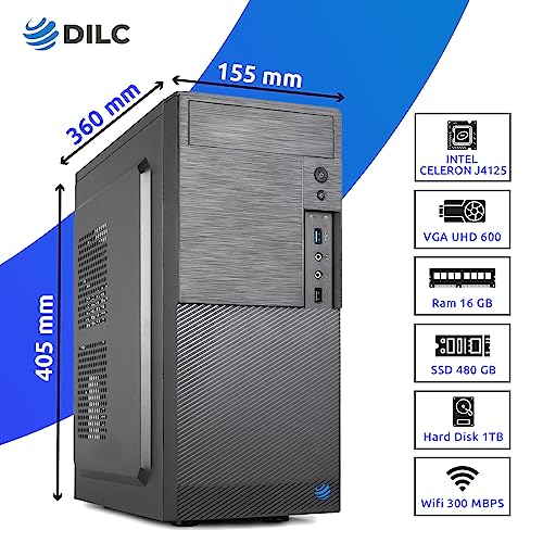 DILC – Ordenador de sobremesa completo montado Green High Plus, procesador Intel Quad Core a 2 GHz, memoria RAM 16 GB, disco duro de 1 TB, DVD-RW, Wi-Fi, 500 W y sistema operativo Windows