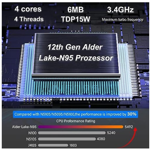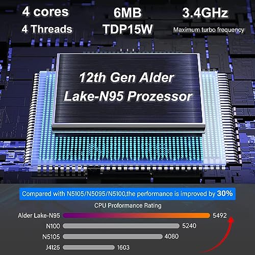 🚀【Procesador 2023 In Alder Lake N95 TDP15W más reciente】 La mini computadora FUNYET está equipada con el último procesador N95, con una frecuencia principal de hasta 3.4GHz, una potencia nominal de 15W y un caché de 6MB. En comparación con n5105/n5095/n5100, In Alder Lake N95 tiene una mejora de rendimiento de hasta un 30 %. La CPU N95 más rápida puede satisfacer su trabajo, navegación por Internet, estudio, familia y otras necesidades. Y mejor compatible con el sistema Windows 11 Pro.