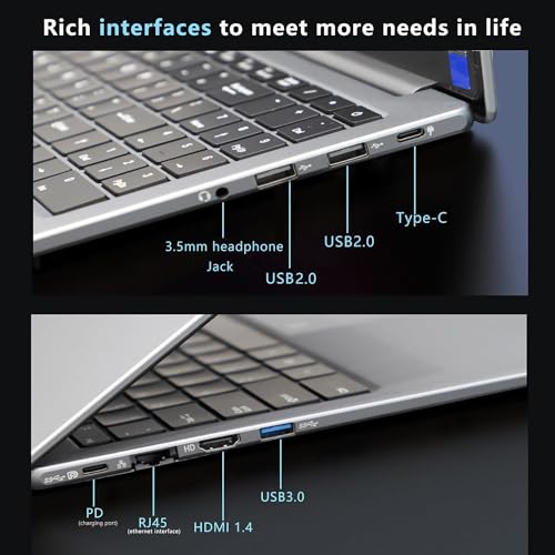 【CONEXIÓN INALÁMBRICA & PUERTOS RICOS】 Computadoras portátiles que admiten Wi-Fi 802.11 a / b / g / n, la señal inalámbrica WiFi es más fuerte y estable, lo que satisface las necesidades de transmisión inalámbrica de big data de alta definición. Los puertos incluyen Micro TF × 1, Mini HDMI × 1, 2x USB-C, 3x USB 3.0, combo de auriculares/micrófono para satisfacer diversas necesidades de oficina.