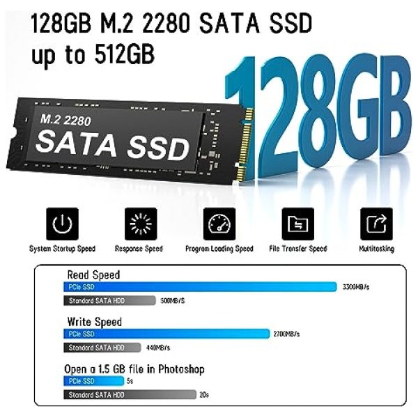 Capacidad ampliable – El sobremesa Golite 11 cuenta con 6 GB de memoria LPDDR4 de doble canal integrada, lo que garantiza una experiencia informática más fluida y tiempos de carga más rápidos en comparación con la DDR3. También es compatible con la ampliación de hasta 512 GB con una SSD SATA M.2 de 128 GB, que ofrece velocidades más altas que una unidad de disco duro (HDD) convencional.