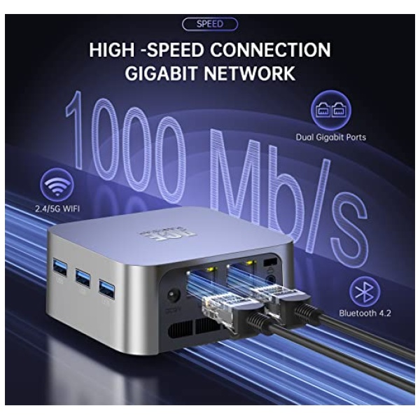 【Dual 1000M Ethernet Ports】El elegante diseño de doble puerto Gigabit Ethernet proporciona más aplicaciones como: cortafuegos, agregación multicanal, enrutamiento suave, servidor de almacenamiento de archivos, etc. IEEE 802.11 a/b/g/n/ac integrado. no importa lo complicado que sea su entorno, el mini pc de sobremesa puede proporcionarle una red relativamente estable y sin problemas.