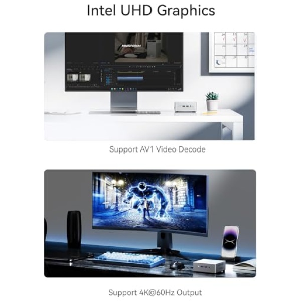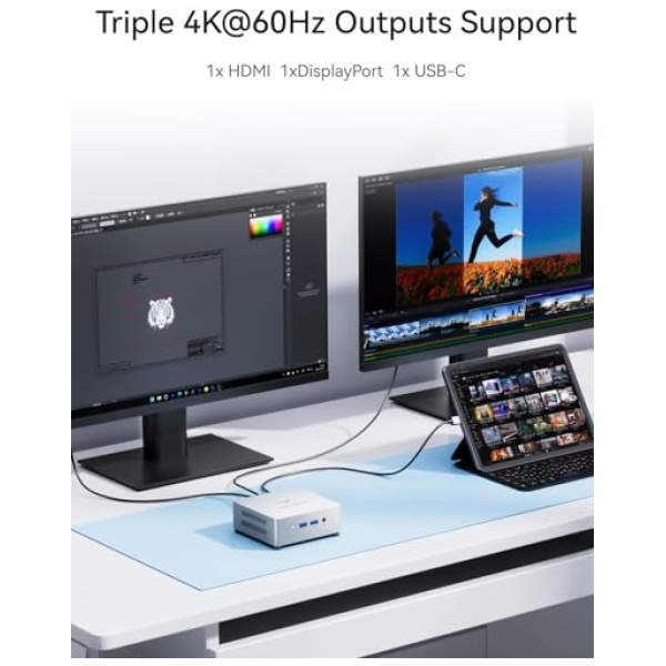 【Salida triple 4K】La mini PC MINIS FORUM UN100L viene con 1 salida de vídeo HDMI, 1 salida DP y 1 salida USB-C, todas compatibles con 4K a 60 Hz. Puedes conectar tres monitores al mismo tiempo para mejorar tu eficiencia en el trabajo o disfrutar de una variedad de entretenimiento.