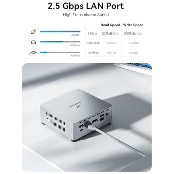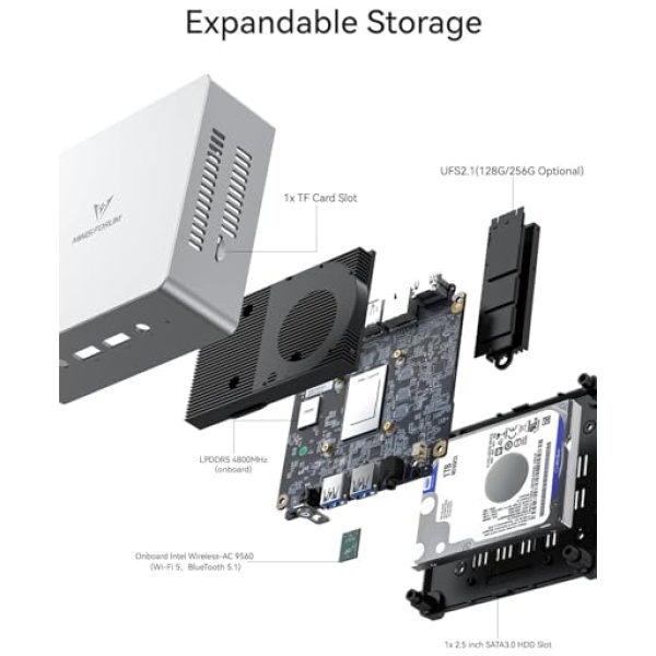 【Gran capacidad】Esta micro PC tiene preinstalada 16 GB LPDDR5 RAM (máx. 4000 MHz) y 512 GB M.2 2280 SATA SSD, puedes reemplazar el SSD hasta 2 TB. Hay otra ranura para disco duro SATA de 2,5 pulgadas disponible, puedes instalar 2 TB. disco duro usted mismo (el grosor es inferior a 7 mm). Por lo tanto, no tiene que preocuparse por quedarse sin almacenamiento y puede guardar aún más sus películas favoritas y documentos importantes.