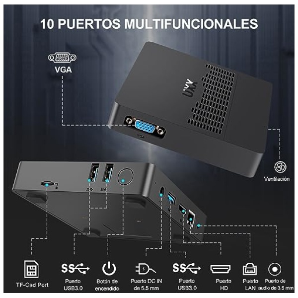 ✔️10x PUERTOS MULTIFUNCIÓN: El pc sobremesa tiene 10 puertos. Hay puertos USB 3.0 x3, MINI HD x1 y VGA x1 para soportar la de doble visualización en pantalla para negocios, educación y entretenimiento usando, puede utilizarse con servidores, monitores, proyectores, televisores, etc, reducir el tiempo de espera. Conexión de interfaz USB 3.0 para una rápida transferencia de archivos. El ordenador de sobremesa tiene entrada/salida de audiox1, botón de encendidodex1, 12 V CCx1, LANx1, TF-Cardx1.