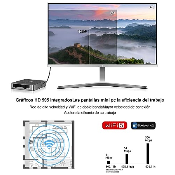 ✔️WIFI+BT CONEXIONES MÚLTIPLES: El mini ordenador es diversificado ordenadores modernos, soporta la última Bluetooth 4.2 y 2.4G+5.0G WiFi de doble banda, LAN 1000Mbps de apoyo que puede navegar por Internet más rápidamente. Bluetooth 4.2 utiliza una tecnología de conexión inalámbrica de alta velocidad que permite conectar varios dispositivos inalámbricos, como un mini ratón, un teclado, un altavoz, cámara, etc. Las tomas de auriculares y micrófono admiten la salida directa de vídeo y audio.