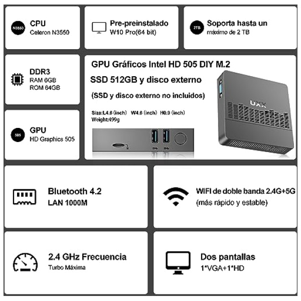 ✔️PODEROSO MINI PC DE SOBREMESA: El gray ordenador de sobremesa un cuerpo más delgado y ligero. El tamaño del pc sobremesa es de sólo 4.6 in * 4.6 in * 0.9 in, y el peso es de 499g. Igual al tamaño de una mochila. Puede colocar fácilmente el mini ordenador en puestos abarrotados y trabajar de forma flexible, ideal para viajes de negocios. Torre pc es alimentado por los últimos procesadores Celeron Apollo Lake N3350 CPU, 10(64 bits) fue preinstalado.