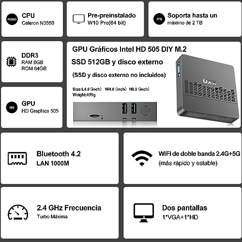 Newest Mini PC Soporte 512GB M.2 SSD Expansión, N3350 Micro Desktop Ordenador 64GB eMMC, Small Gaming PC 4K UHD HD VGA Doble Mostrar, BT, 2.4G/5G WiFi, USB 3.0, para Oficina/Hogar