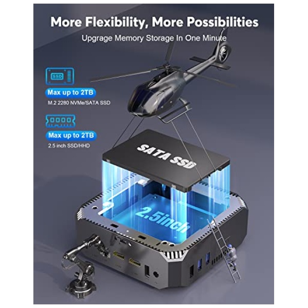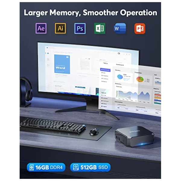 【16GB DDR4 + 512GB SSD, Tareas Sin Esfuerzo】- NiPoGi N100 mini computer viene con memoria 16 GB RAM DDR4 de un solo canal integrada (máx. 3200 MHz) y SSD M.2 de 512 GB, asegurando multitarea sin demoras. Ahora la mini torre ordenador está lista para asumir cargas de trabajo exigentes y ayudarlo a despedirse del retraso y la falta de respuesta. Puede ampliar el almacenamiento hasta 2 TB con SSD SATA M.2, interfaz SSD Nvme o HDD SATA de 2,5″ (ambos no incluidos).