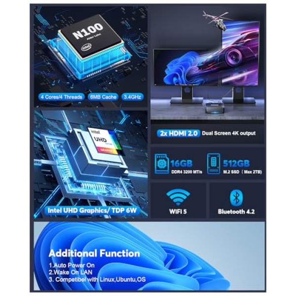 【Sistema más Estable】NiPoGi AK2 PLUS mini computer viene con el sistema operativo, también es compatible con Linux, Ubuntu, Auto Power On, RTC Wake Settings y Wake On LAN. El CPU Alder Lake-N100 ofrece un rendimiento rápido y fluido para las necesidades de productividad y entretenimiento, y es excelente para alguien que lo necesita para la oficina comercial, el entretenimiento, la escuela, la investigación o la navegación en las redes sociales.