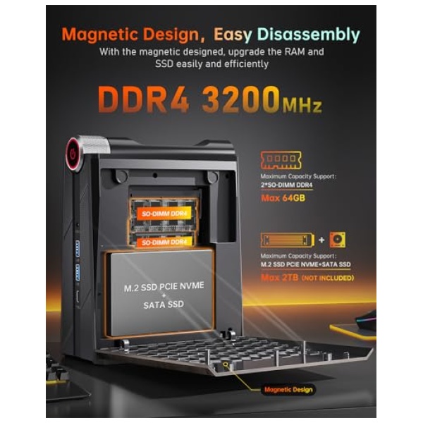 【Gran Capacidad – 32GB DDR4 & 512GB M.2 SSD】 La mini computadora está equipada con doble canal de 32GB DDR4(2×16 GB, máx. 64 GB) y SSD NVMe de 512 GB.Puede reemplazar el SSD con un máximo de 2TB o agregar un HDD/SSD de 2TB y 2,5 pulgadas (no incluido).La mini pc gaming diseñado para los amantes de los juegos, ofrece una velocidad de carga de juegos más rápida y un procesamiento de gráficos más rápido con un aumento de rendimiento de alrededor del 20 %. Un pc mini torre que no te puedes perder.