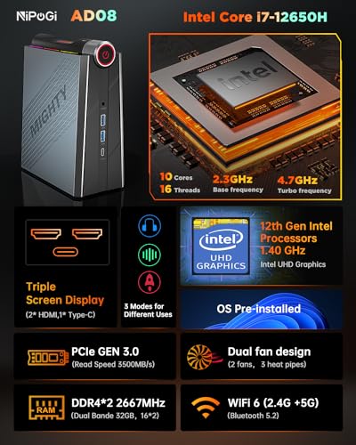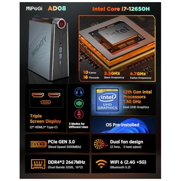 【Multitarea Fácil y Eficiente】La AD08 mini pc 32gb ram viene preinstalada, lo que le brinda una experiencia de operación fluida. Además de 2x HDMI 2.0 y 1x tipo C (4K@60GHz), puede conectar 3 pantallas al mismo tiempo.NiPoGi mini pc i7 apoyo 4x USB 3.2, perfecto para realizar múltiples tareas, ahorrar tiempo y aumentar la productividad.