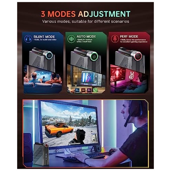 【Diseño Único de 3 Modos】AD08 mini pc sobremesa está equipado con 3 modos: Modo Silencioso/Modo Automático/Modo Rendimiento. El modo silencioso es adecuado para ver películas,el modo automático es adecuado para el software de escritorio normal y el modo rendimiento es adecuado para jugar.Puede cambiar el modo por interruptor, lo que ahorra mucha energía.Con el diseño vertical único, esta mini pc i7 ocupa casi el mismo espacio que un teléfono móvil, ahorrando espacio y decorando el escritorio.
