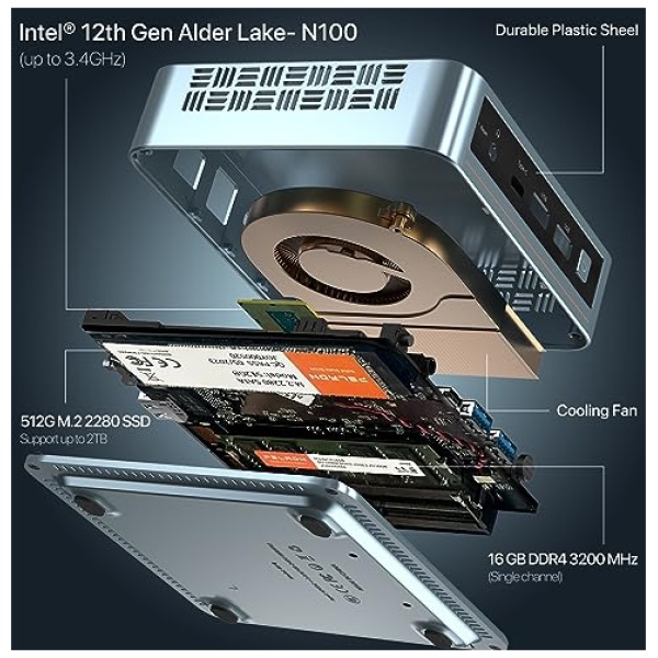 ?Ddr4 de 16 Gb + Ssd de 512 Gb, actualización de soporte? La mini PC Peladn Wi-6 N100 viene con una memoria RAM Ddr4 de 16 Gb de un solo canal (máx. 3200 Mhz) y un SSD M.2 de 512 Gb. La gran capacidad le permite cambiar entre más aplicaciones y almacenar más documentos o películas favoritos.