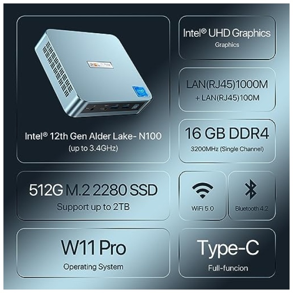 PELADN WI-6 Pro Mini PC, Intel 12.ª generación Alder Lake-N100 (hasta 3,4 GHz), 16 GB DDR4 RAM, 512 GB M.2 PCIe SSD, ordenador de escritorio con soporte para USB 3.2, WiFi 4, BT5.2 y Win 11 Pro.