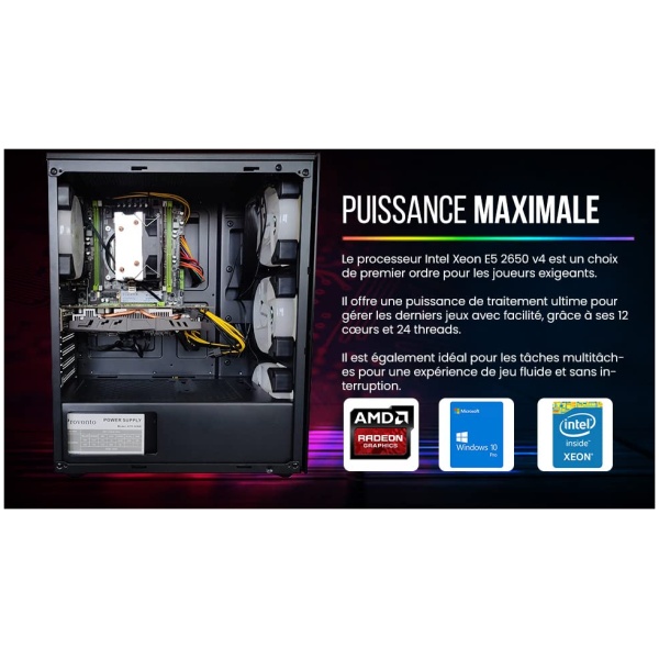 El PC Gamer está equipado con el procesador Intel Xeon E5-2650 v4 de 12 núcleos, una tarjeta de video AMD Radeon RX 580 con 8 GB de memoria gráfica, 16 GB de RAM y un SSD de 512 GB. Si eres un jugador incondicional, este es el tipo de PC para ti. El PC también cuenta con un lujoso armario que cumple con todas las exigencias de un jugador apasionado: