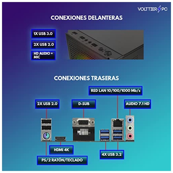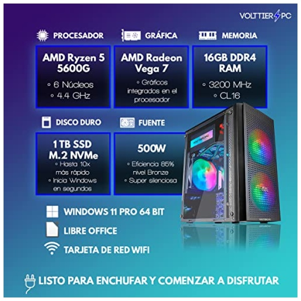 VolttierPC – PC Gaming AMD Ryzen 5 5600G 6×4.4Ghz | 16GB RAM DDR4 | 1TB M.2 SSD | Tarjeta Gráfica AMD Radeon Vega 7 | WiFi | Windows 11 Pro | Ordenador Gamer