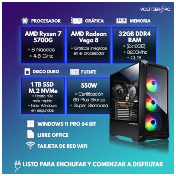 VolttierPC – Pc Gaming AMD Ryzen 7 5700G 8×4.6Ghz | Radeon Vega 8 | 32GB DDR4 | 1TB SSD M.2 NVMe | WiFi | Windows 11 | Ordenador de Sobremesa | Pc Gamer
